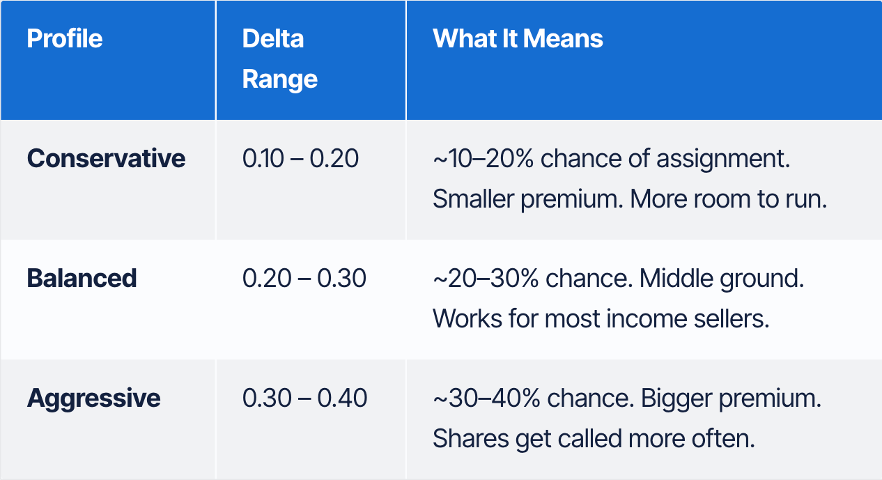 Lower delta = strike is further away = less premium, but you’re more likely to keep your shares and ride further upside.