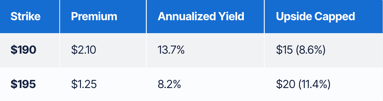 — $195 strike: Lower yield, more room. Good if you want to ride more upside.