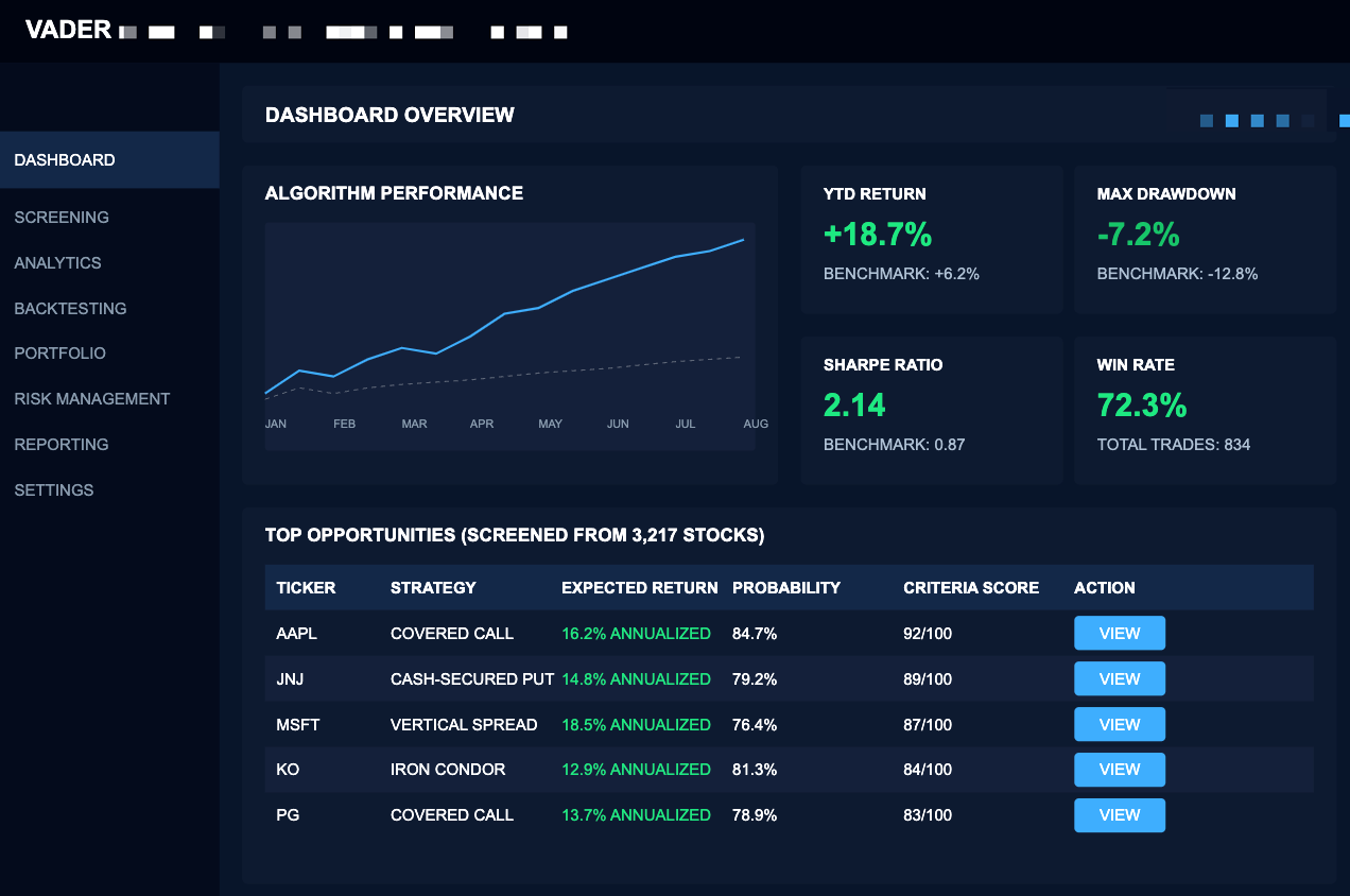 Behind the scenes, VADER, my proprietary algorithm, scans over 450,000 option contracts across 3,200 stocks each morning — identifying only the ≈ 0.005% most efficient income setups.