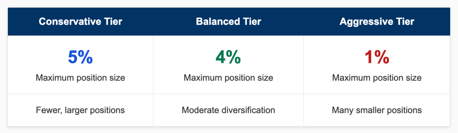 Trades are sorted by Risk Tier (Conservative 8–12 %, Balanced 15–25 %, Aggressive 25 %+) and Collateral Band (under $10k / over $10k).
