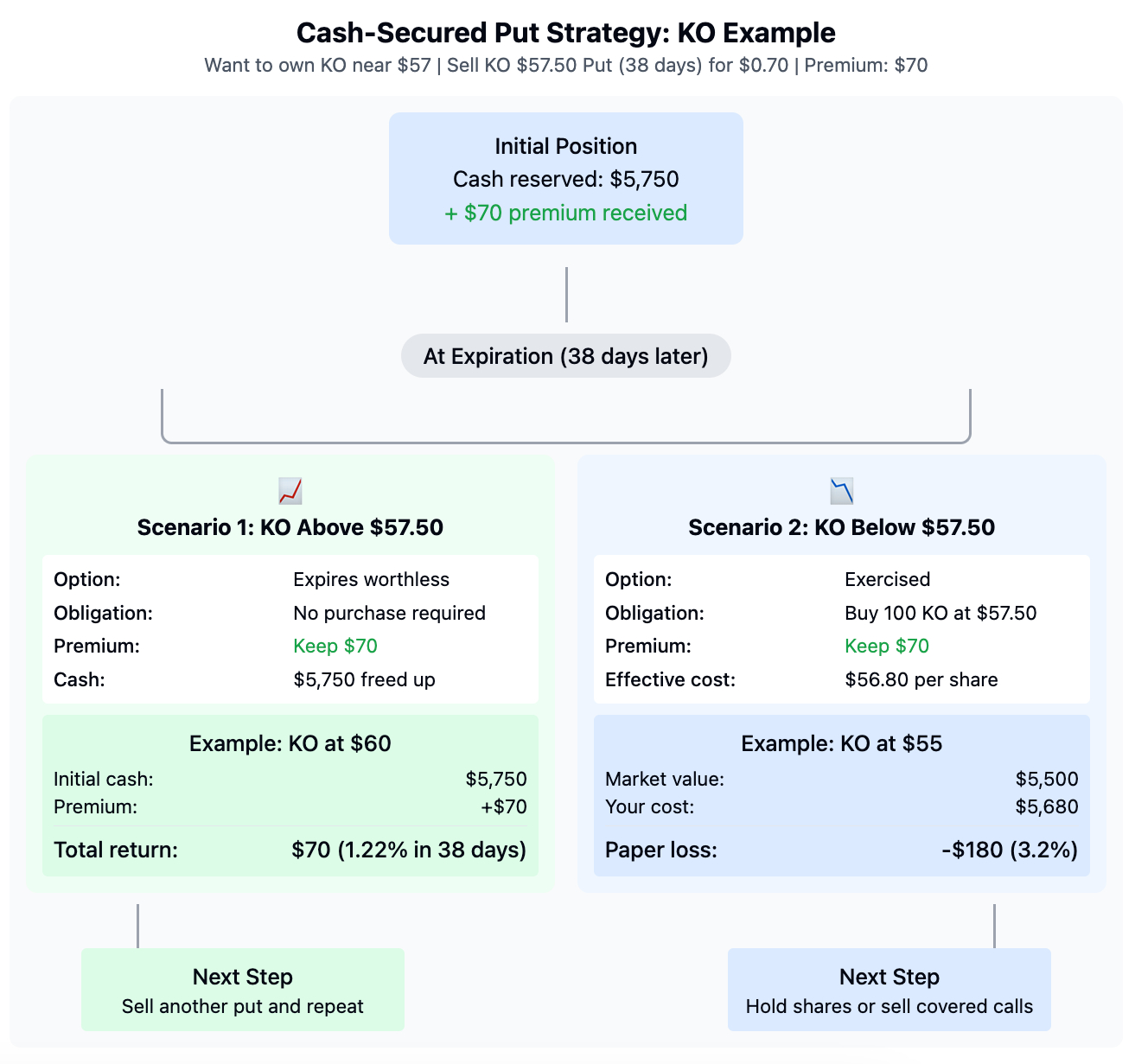 "Do I need $100k?" No. $25k runs clean. Under $10k is clunky but doable. The key constraint is that each cash-secured put or covered call controls 100 shares, so smaller accounts need to focus on lower-priced stocks. A $10k account can comfortably run this strategy on stocks priced under $50.