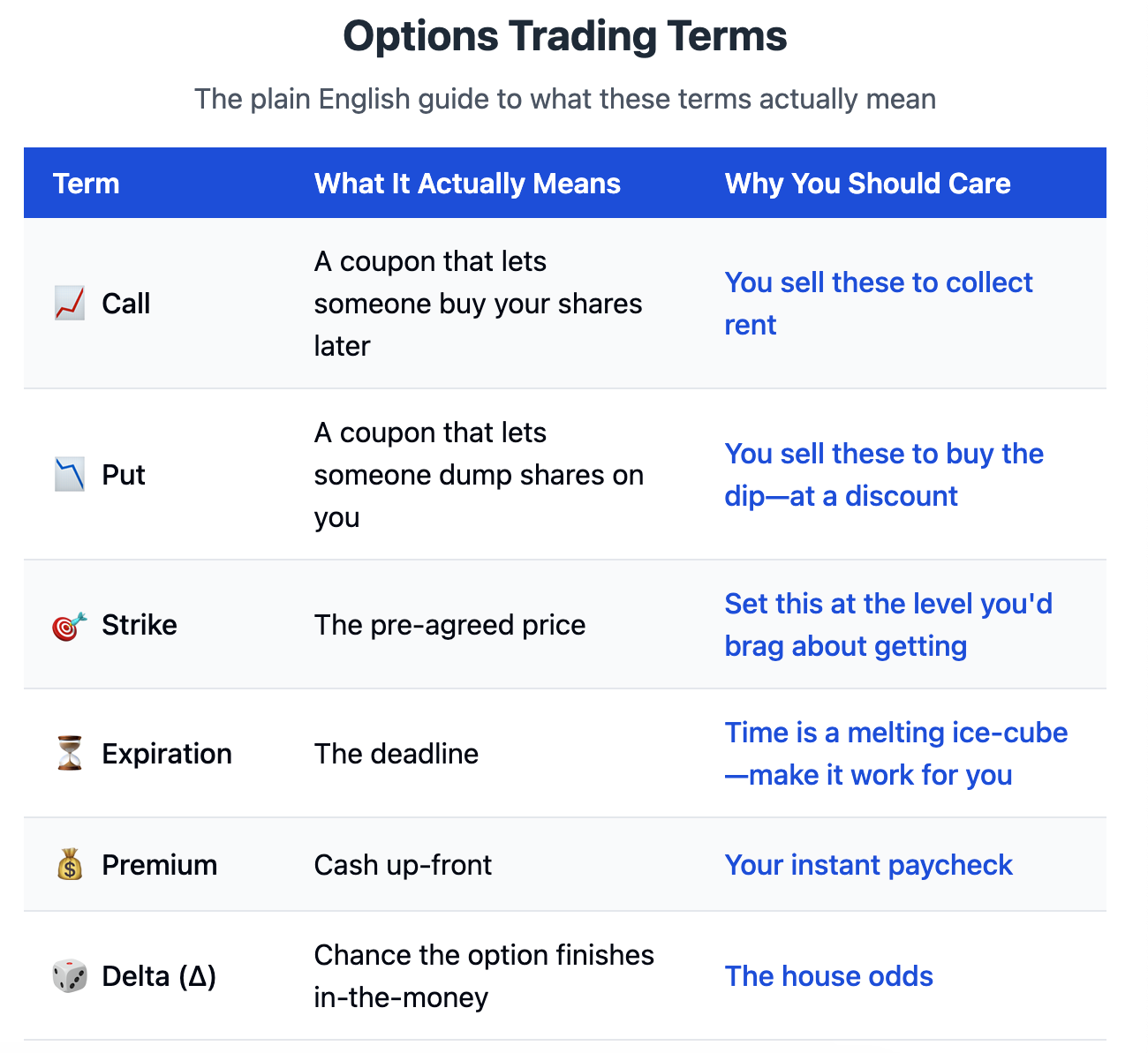 Covered-Call & Options Income – Renting upside on stocks you already own and getting paid to wait on those you want to own.