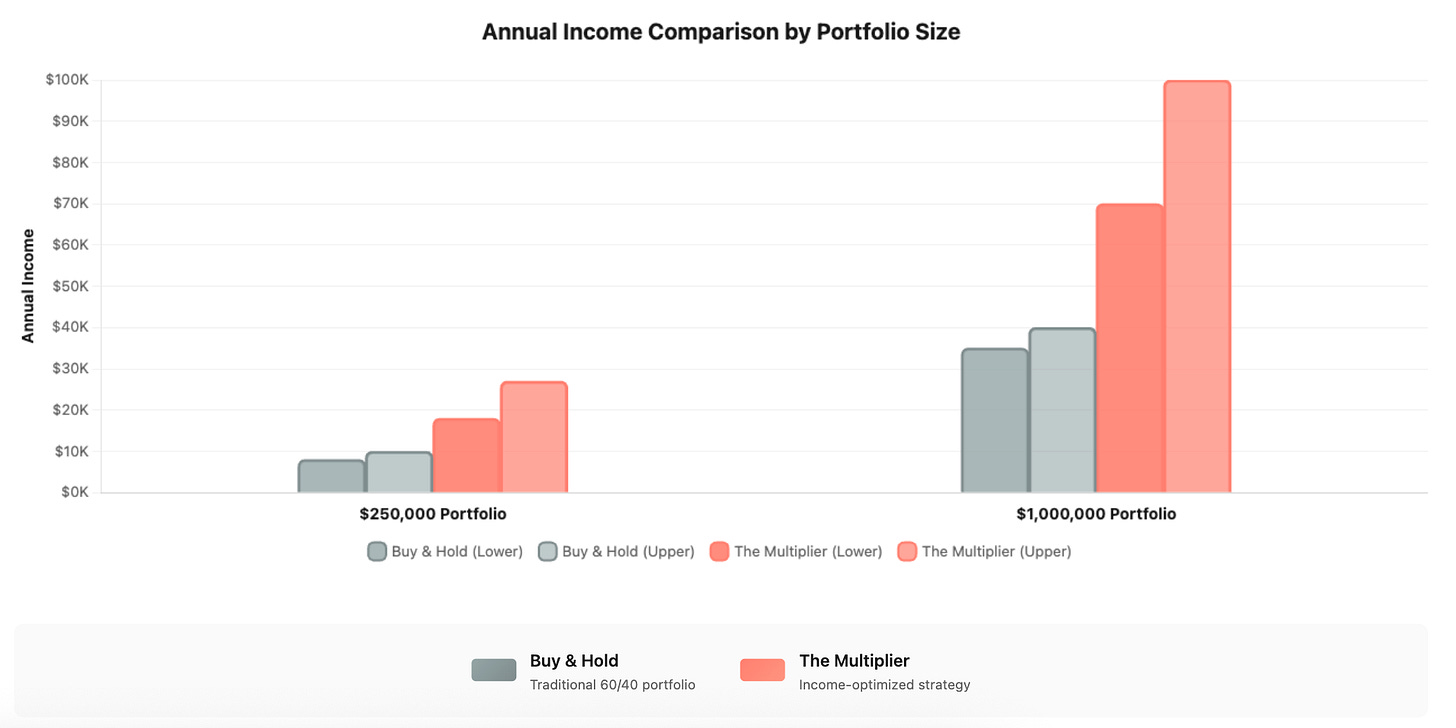 Run that same million through The Multiplier + VADER and it produces $70,000–$100,000 a year — more than double the income without selling a single share.