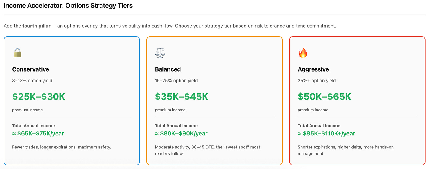 Now we add the fourth pillar — the options overlay that turns volatility into cash flow. Readers can choose how actively to run it through the three VADER tiers: