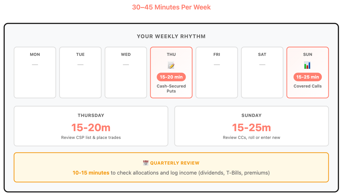 Each quarter, spend another 10–15 minutes to check your allocations and log your income — dividends, T-Bill interest, and premiums. You’ll see the system working in real numbers.