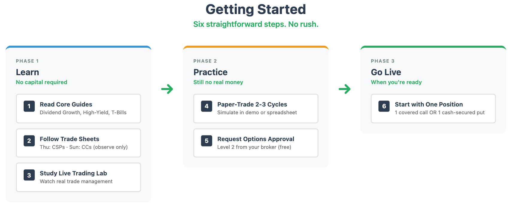 Review the Cash-Secured Put list, choose one or two setups that fit your tier, and place or paper-trade them.Sunday — 15–25 minutes