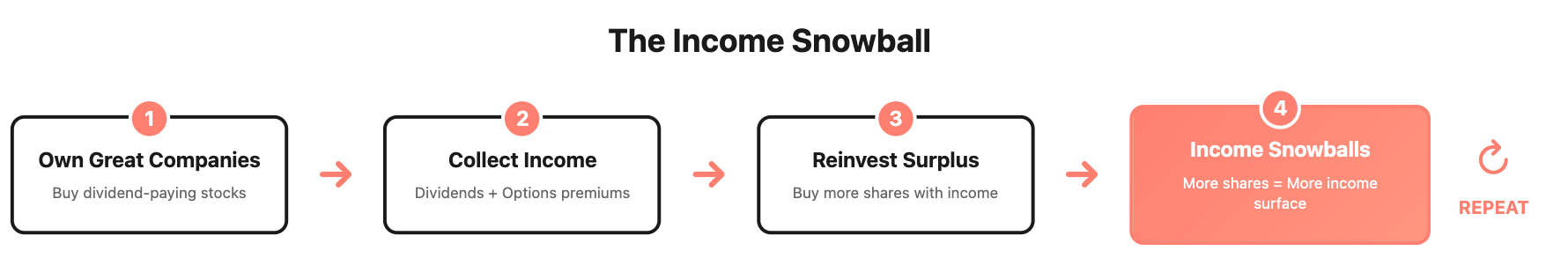 Each cycle builds on the last: premiums fund more shares, new shares earn more dividends, and the wheel keeps turning.