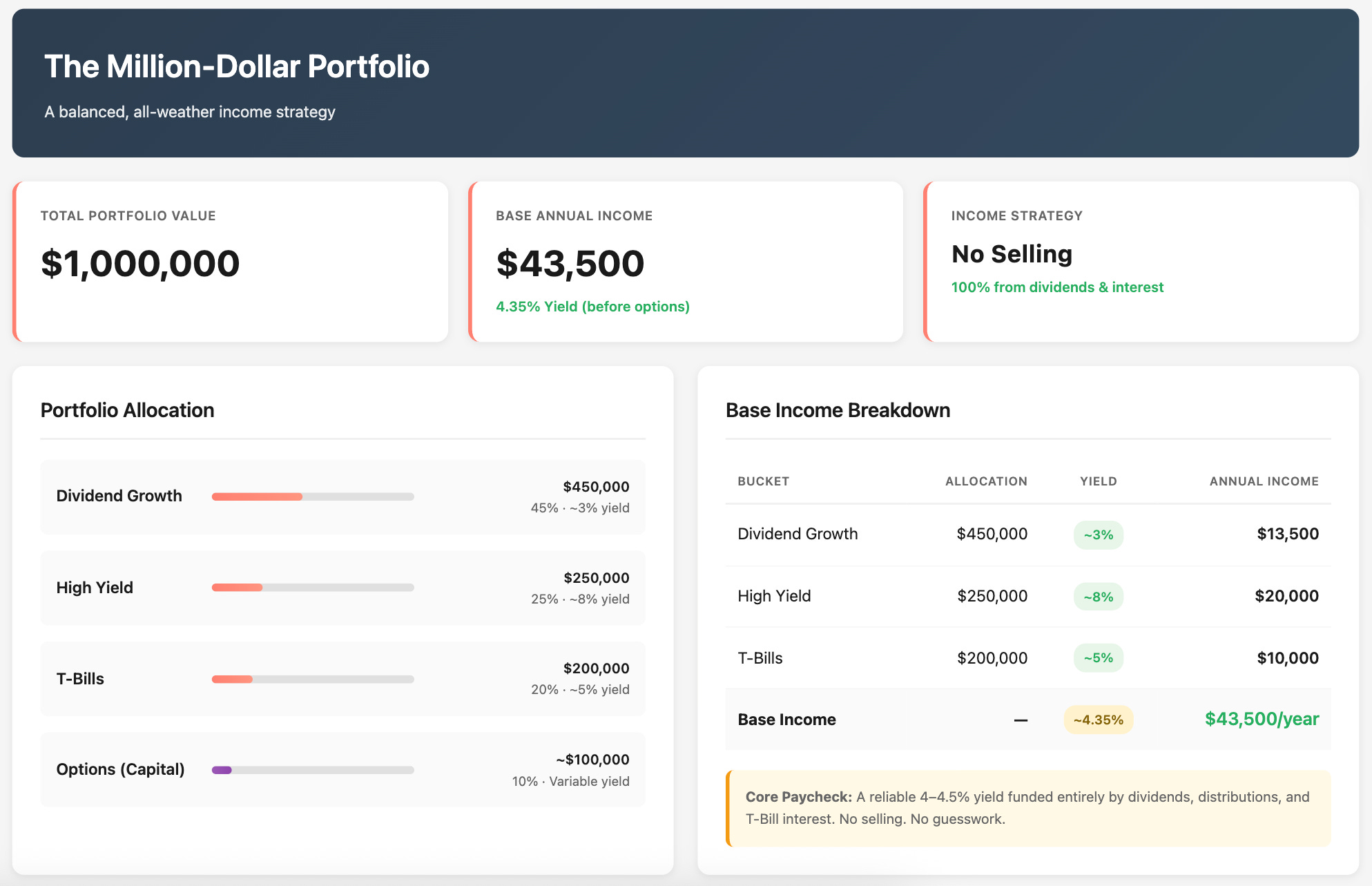 Even in a market drop, your income base — dividends, high-yield distributions, and T-Bill interest — keeps paying. The options layer simply adjusts to new prices, generating fresh premiums as volatility rises.