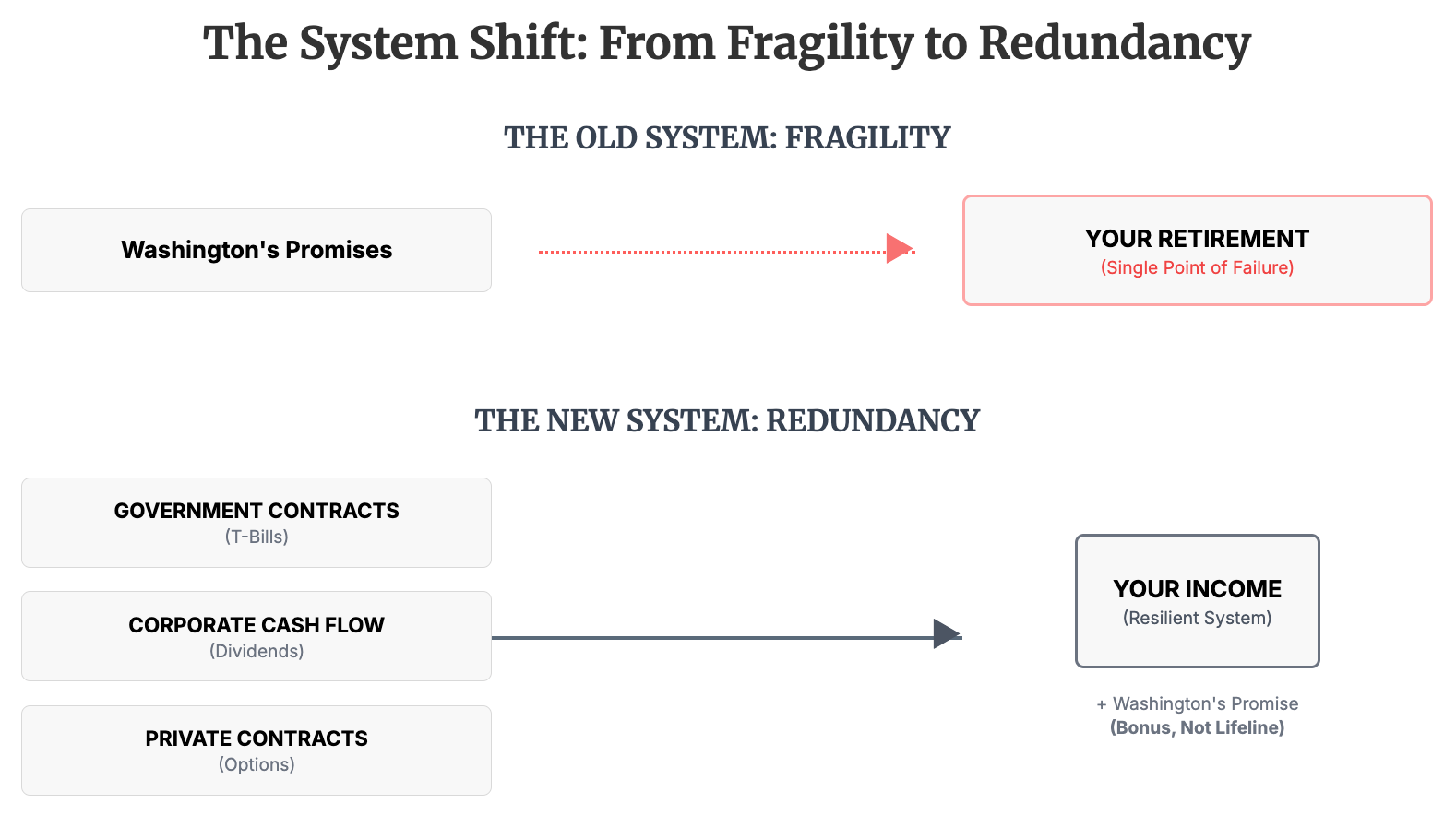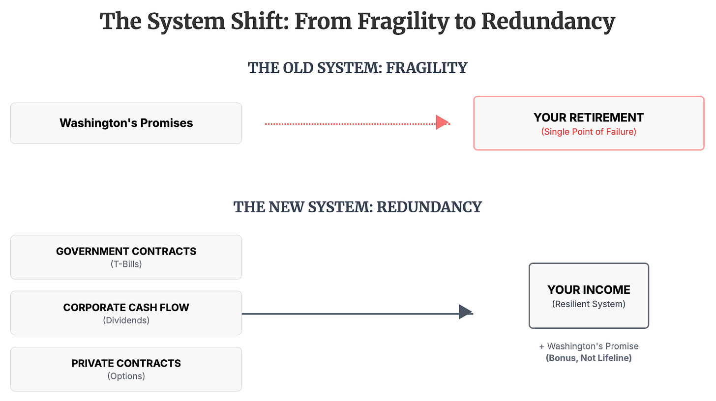You need to construct a private system of cash flow so redundant that the failure of any one component - especially a government promise - doesn't matter.